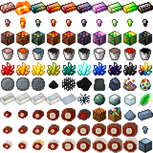 This image shows most of the custom items available in the modpack. The top 4 rows show different versions of the various alloys, row 5 shows the custom crystal materials, row 6 and 7 show mostly the scientific materials, with a few extra items at the end, and finally the last 3 rows show the system used to build spawn eggs from animal parts, as well as a few extra items at the end.