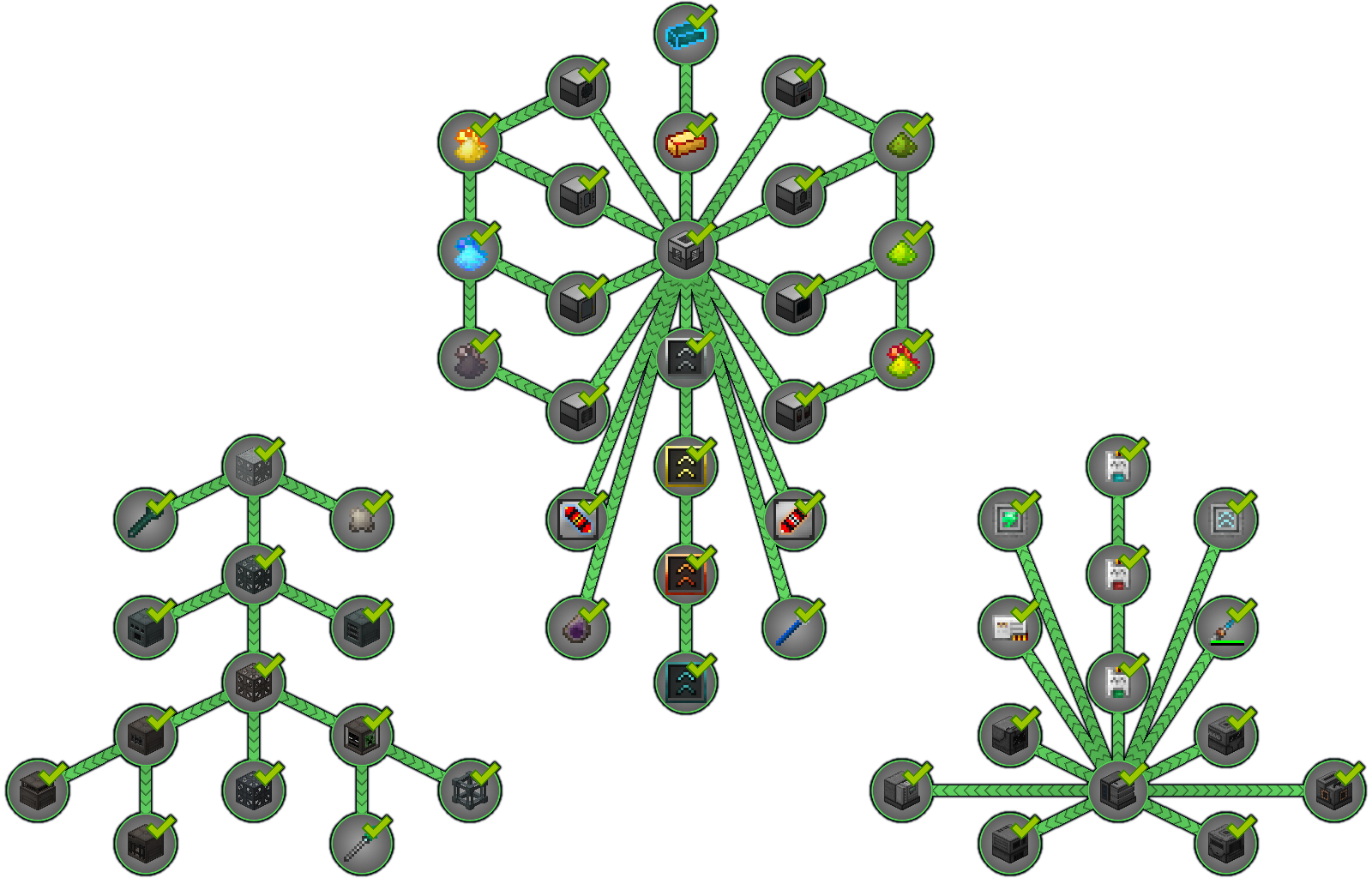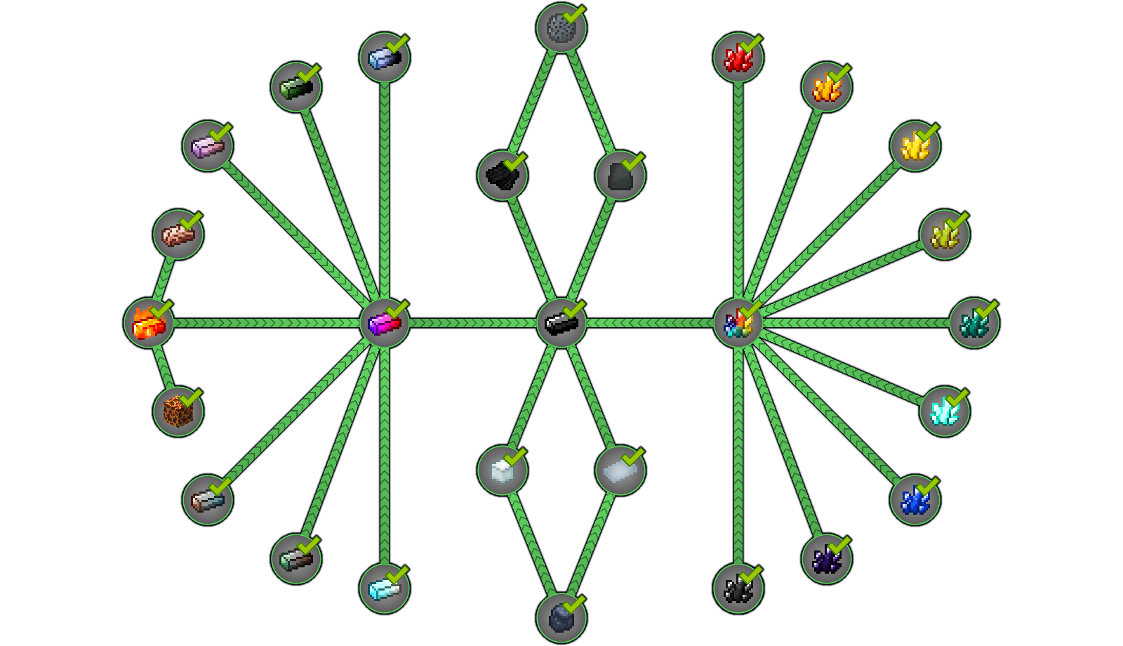 The custom quest line guides you through creating all of the custom items created for this modpack. The left tree shows how to combine items to create alloys made up of all the other metals in the game. The right tree shows how to make unique crystal types by infusing quartz with various materials. The top tree shows how to make carbon nanotubes and graphene. Finally, the bottom tree shows how to make dry ice and aerogel.